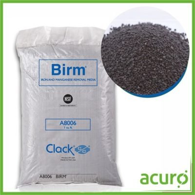 Birm is an efficient and economical method of removing iron and manganese compounds from raw water supplies. It may be used in either gravity fed or pressurized water treatment systems. It acts as insoluble catalyst to enhance the reaction between dissolved oxygen (D.O.) and the iron compounds. In ground water dissolved iron is normally in the ferrous bicarbonate state due to the excess of free carbon dioxide and is not filterable. Birm acts as a catalyst between the oxygen and soluble iron compounds and enhances the oxidation reaction of Fe++ to Fe+++ and produces ferric hydroxide which precipitates and is easily filtered. Birm is easily cleaned by backwashing to remove the ferric hydroxide. It is not consumed in the iron removal process and therefore provides a positive economic advantage over many other iron removal medias. Other advantages of birm include long material life with relatively low attrition loss, a wide temperature performance range and extremely high removal efficiency. Under the proper water conditions, no chemicals are required for maintenance. Regeneration is not required. Birm is also used to achieve manganese reduction. When used to reduce manganese, the water to be treated should have a pH between 8.0-9.0 for best results. If both manganese and iron are to be removed, the water to be treated should have a pH below 8.5.